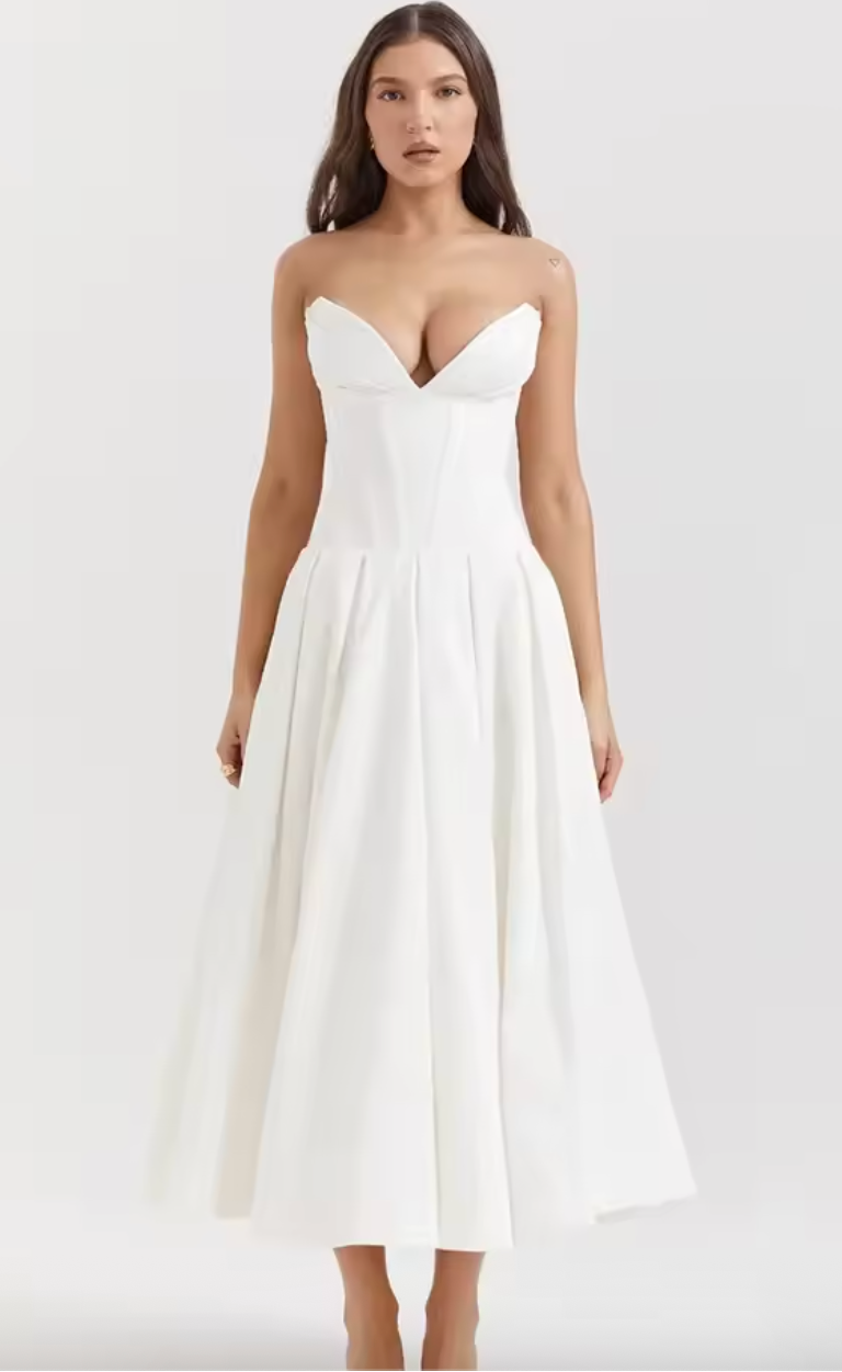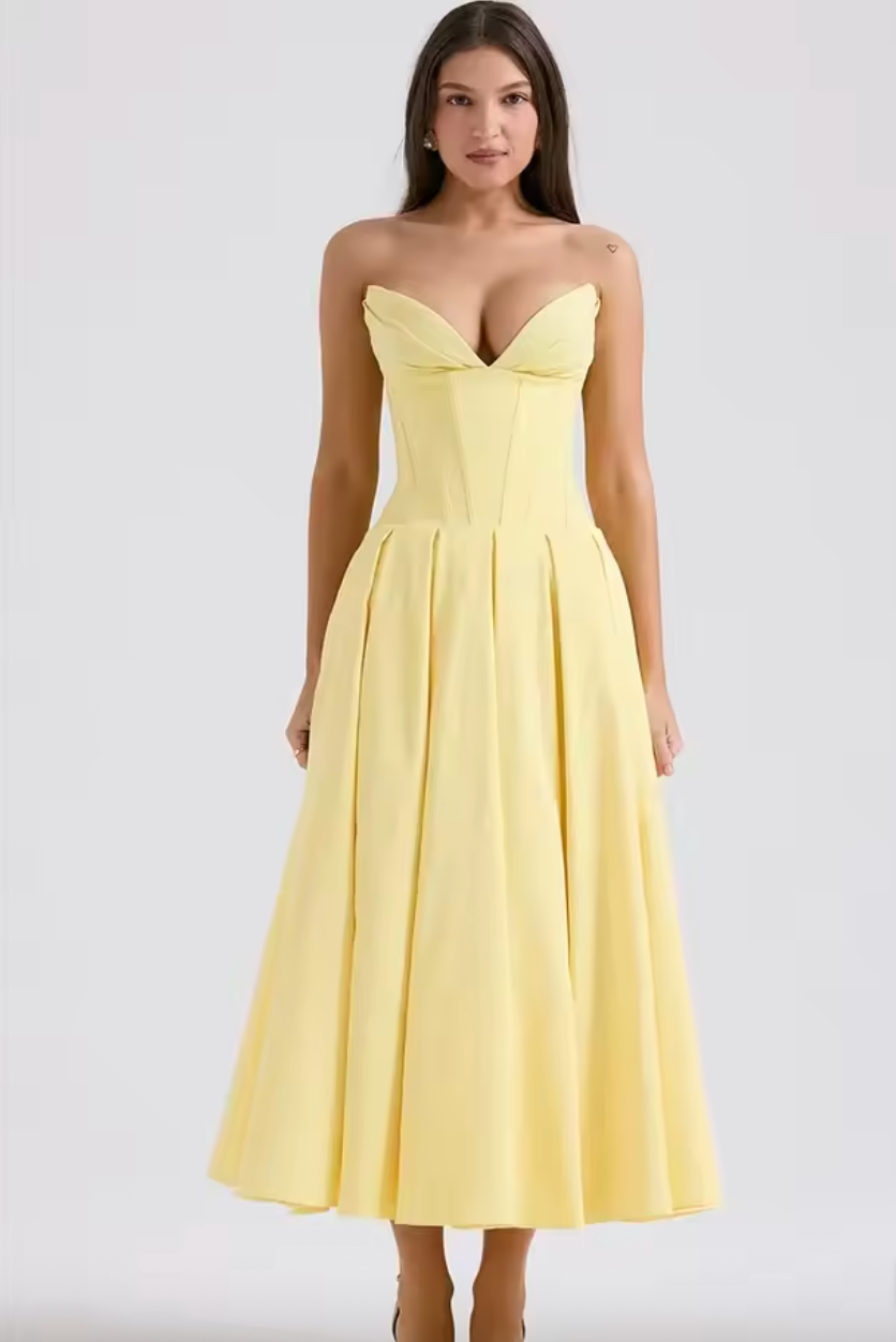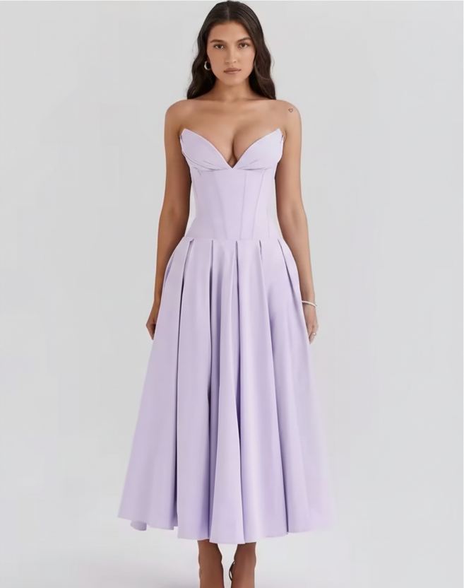 See kleit õhkub kuninglikku elegantsi oma pika aristokraatliku joonega ja kõrge vöökohaga, mis toob esile iga silueti. Ideaalne nii pidulikeks sündmusteks kui ka erilisteks hetkedeks ajatu stiiliga.