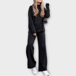 Elegantne komplekt, mis rõhutab ajatut elegantsi ja minimalistlikku iseloomu. Selle paindlik disain kohandub kergesti teie stiiliga, muutes selle ideaalseks nii vabaaja kui ka elegantsemateks sündmusteks. Pehme tekstuur pakub mugavust, samas kui lai lõige muudab selle ideaalseks igapäevaseks kasutamiseks, pakkudes pretensioonitut elegantsi.