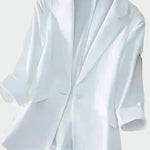 Elegantne ajatu lõige ja moodsa disainiga jakk. See on reväärkrae, ühe nööbiga esikinnitus ja pikad varrukad dekoratiivsed nööpidega allääres. Sirge lõikega jakk sobib suurepäraselt nii kohandaks kui ka lõdvestunud välimuseks. Rõivas, mis lisab igale riietusele stiili ja elegantsi.